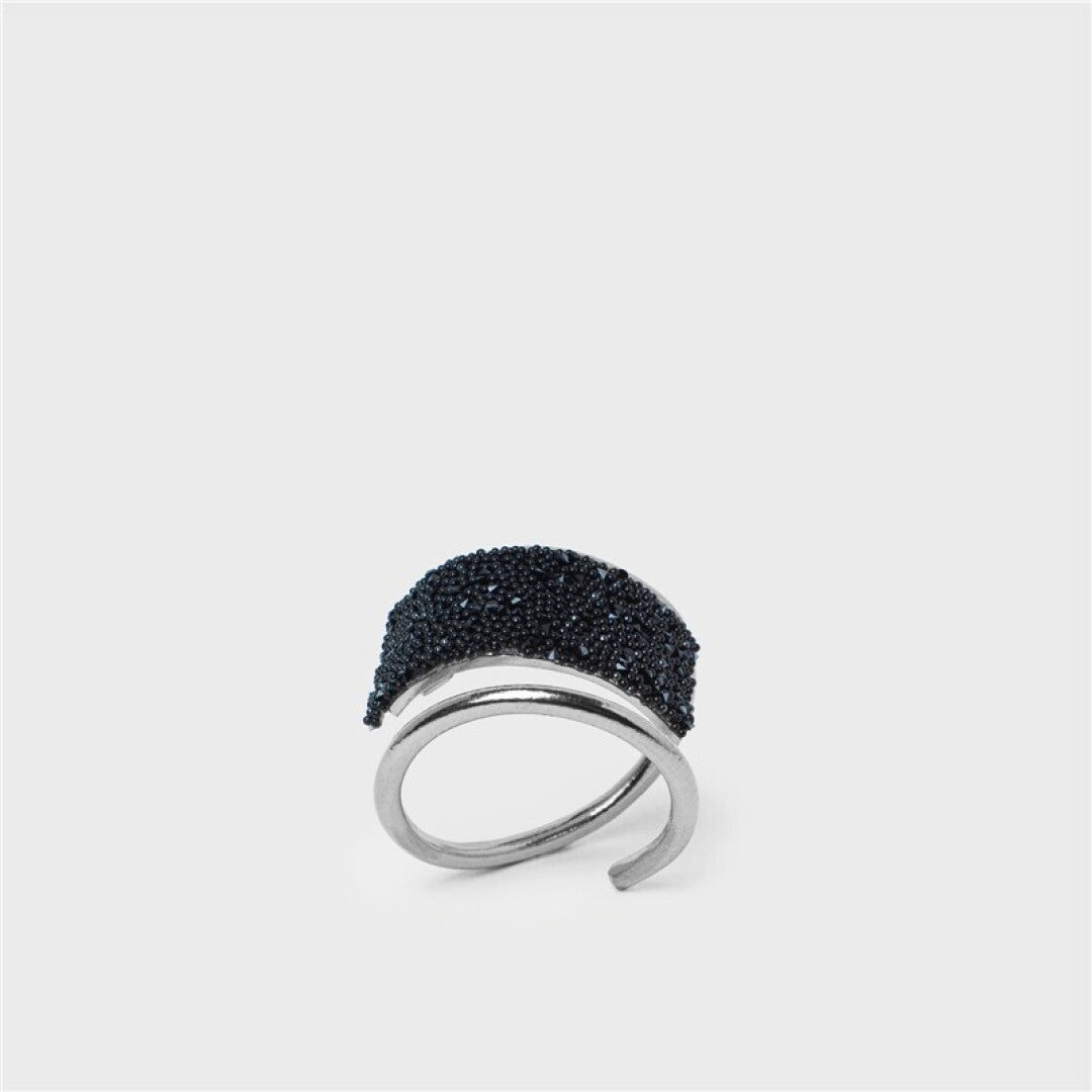 Anillo plateado con cristales. Una losa de cristales oscuros cubre magistralmente el dedo, colocado sobre un delicado marco que demuestra una vez más que cuando está en manos de los diseñadores adecuados, la fusión de formas puede convertirse en el epítome de lo ultraelegante.